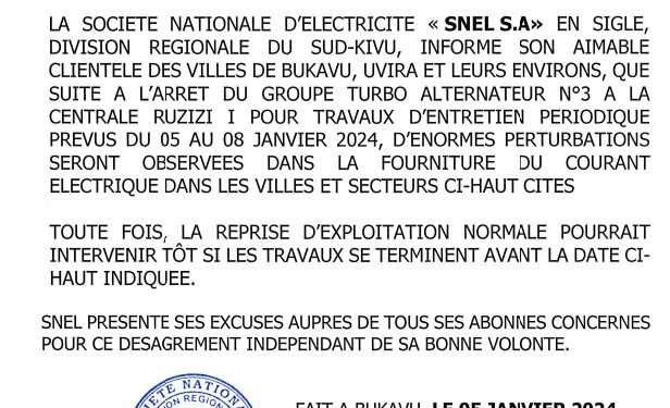 Dans un communiqué de la société nationale d’électricité SNEL, direction régionale du sud Kivu rendu public le vendredi 05 Janvier 2024, cette société informe son aimable clientèle des villes de Bukavu, Uvira et leurs environs que pour raison des travaux d’entretien périodique prévus du 05 au 08 Janvier 2024, elle va procéder à l’arrêt du groupe turbo alternateur № 3 à la centrale Ruzizi 1.