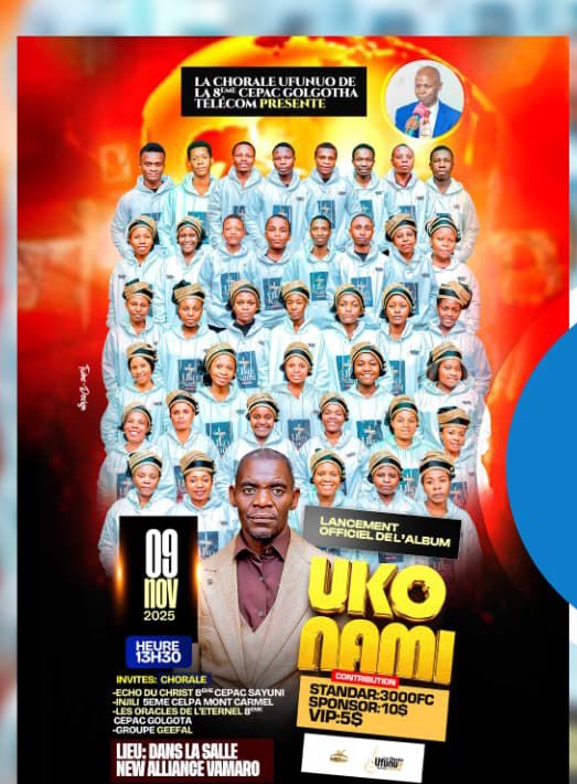 La date du 9 novembre 2025 s’annonce historique pour les amateurs de musique religieuse à Bukavu. Dans 18 jours exactement, la chorale UFUNUO de l’église 8ème CEPAC Golgotha / Télécom, dirigée par le Révérend Pasteur Wilondja Nyangi, organise un événement inédit . Il s’agit de la sortie officielle de son tout premier album intitulé « Uko Nami ».