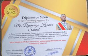 Le Bloc Uni pour le Développement du Congo (BUDC), regroupant plusieurs mouvements citoyens et groupes de pression, a honoré Maître Byamungo Kazimiri Samuel, Bourgmestre de la commune de Kadutu, à Bukavu, chef-lieu du Sud-Kivu en lui décernant un diplôme de mérite. Cette distinction vient saluer son engagement et ses réalisations concrètes en matière de développement local.