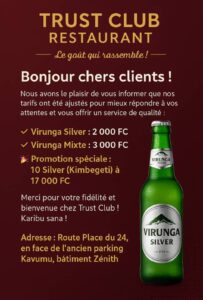 Chers habitants de la ville de Bukavu, chef-lieu de la province du Sud-Kivu, si vous êtes à la recherche d’un lieu convivial où déguster une bonne nourriture accompagnée de boissons de qualité à des prix promotionnels, une seule adresse s’impose désormais en commune d’ibanda.