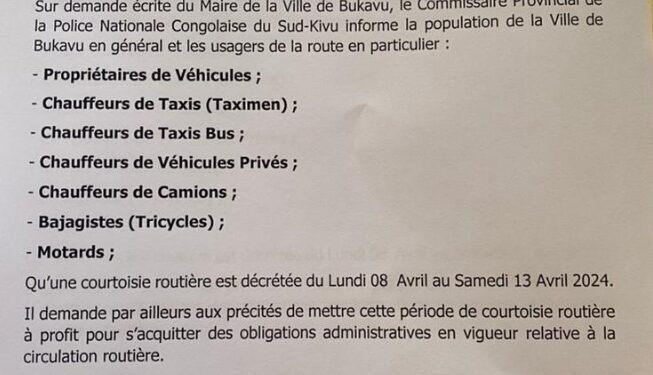 Une courtoisie de 6 jours à partir du lundi 08 jusqu’au samedi 13 Avril 2024 vient d’être décrétée par le commissaire provincial de la police nationale congolaise de la province du sud Kivu en faveur des propriétaires de véhicules et motos.