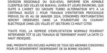 Actualités Sud Kivu : Arrêt de l’un des groupes TA de la SNEL à la centrale Ruzizi 1 pour des travaux d’entretien, des perturbations dans la fourniture du courant électrique seront observées momentanément dans les villes de Bukavu et Uvira 6 janvier 2024