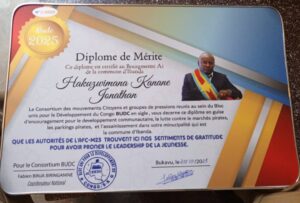 La commune d’Ibanda, au cœur de la ville de Bukavu, continue de rayonner grâce à un leadership engagé et orienté vers l’action. En reconnaissance de ses efforts remarquables, Hakuzwimana Kanane Jonathan, Bourgmestre ad intérim de cette municipalité, vient de recevoir un diplôme de mérite décerné par le Bloc Uni pour le Développement du Congo (BUDC), une plateforme regroupant plusieurs mouvements citoyens et groupes de pression œuvrant pour le progrès national.