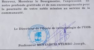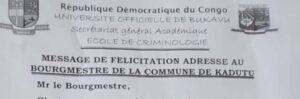 L’ancien bourgmestre de la commune de Kadutu et actuel directeur de l’école de criminologie à l’Université Officielle de Bukavu (UOB), le professeur MUNYABENI NYEMBO Joseph a, dans un message de félicitations salué les efforts entrepris par l’actuel bourgmestre sous l’AFC-M23, maître BYAMUNGO KAZIMIRI Samuel, pour le développement de cette entité.