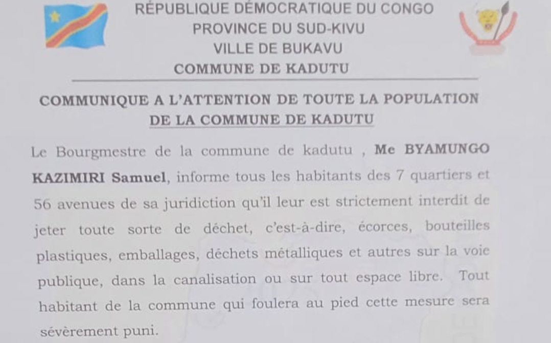 Avec cette mesure, la commune de Kadutu entend non seulement préserver la santé publique, mais aussi restaurer l’image d’une entité en pleine reconstruction. Les habitants sont ainsi appelés à faire preuve de civisme, de responsabilité et d’engagement citoyen, car la propreté de la commune dépend avant tout de la conscience collective.
