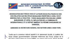 Enfin, les tueries récentes à Mikenge, Minembwe, Luvungi et Uvira, marquées par l’exécution de civils innocents, notamment des jeunes en prière, traduisent l’échec total des institutions de protection. Les forces vives appellent à une mobilisation nationale contre le tribalisme, la haine et l’impunité. Elles exigent la fin immédiate des violences et le départ du régime actuel, tout en appelant la communauté internationale à cesser son silence complice et à se ranger aux côtés des populations congolaises en quête de justice et de dignité.